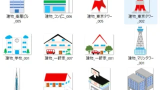 コンビニ、東京タワー、マリンタワー、家、アパート等の平面、立体図があります。